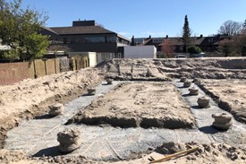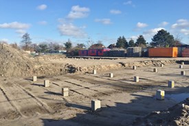 De funderingspalen zijn klaar en de werkvloer voor de daadwerkelijke funderingsbalk wordt/ is aangel...